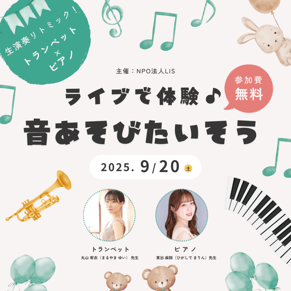 「ライブで体験♪ 音あそびたいそう」開催のお知らせ(2025年9月20日・志木市) NPO法人LISでは、未就学児およびその保護者を対象とした無料音楽体験イベント「ライブで体験♪ 音あそびたいそう」 を、2025年9月20日(土)に志木市宗岡第二公民館で開催いた... -