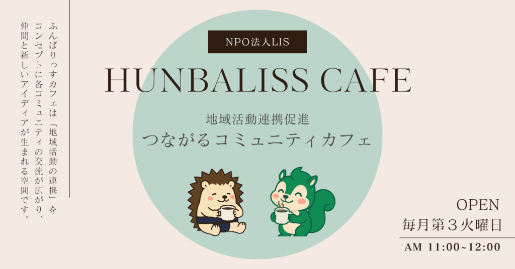 地域のつながりを、ゆるやかに。ふんばりっすカフェは、NPO法人LISが運営する月1回のコミュニティカフェです。地域の方が気軽に集い、お茶を飲みながらおしゃべりできる、あたたかな居場所を目指しています。 開催概要 開催日:毎月第3火曜日 時間:11:00... -